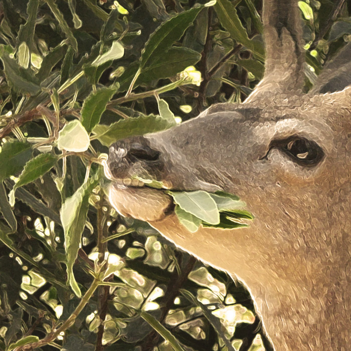This young male was so blissfully chewing away on the Toyon leaves, that he hardly seemed to notice me standing at the window taking photos. It was a beautiful few moments. But, the image looked so washed out and lifeless to me. I wanted to try and add more of the warmth and intimacy that I had felt. Also, the background was very bright and eye-catching, so I hoped to even out the light some, make it twinkle a bit, and highlight all the wonderful leaves.